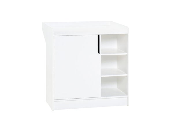 dużo miejsca do przechowywania oraz podręczne otwarte półki. Łóżeczko łatwo przekształcasz w tapczan, gdy dziecko podrośnie. Zaokrąglone krawędzie i biały kolor mebli wprowadzają do wnętrza spokój oraz poczucie bezpieczeństwa.