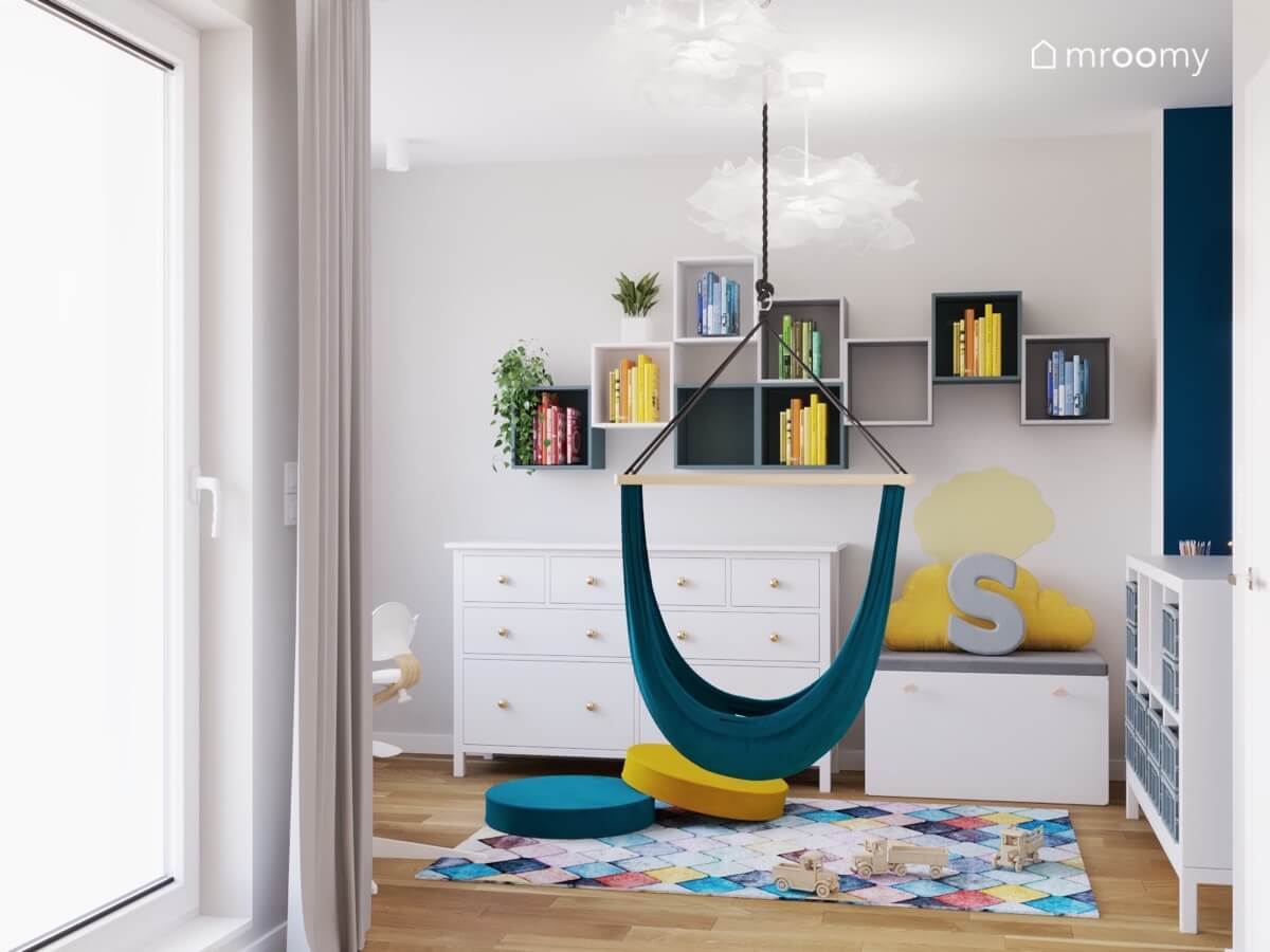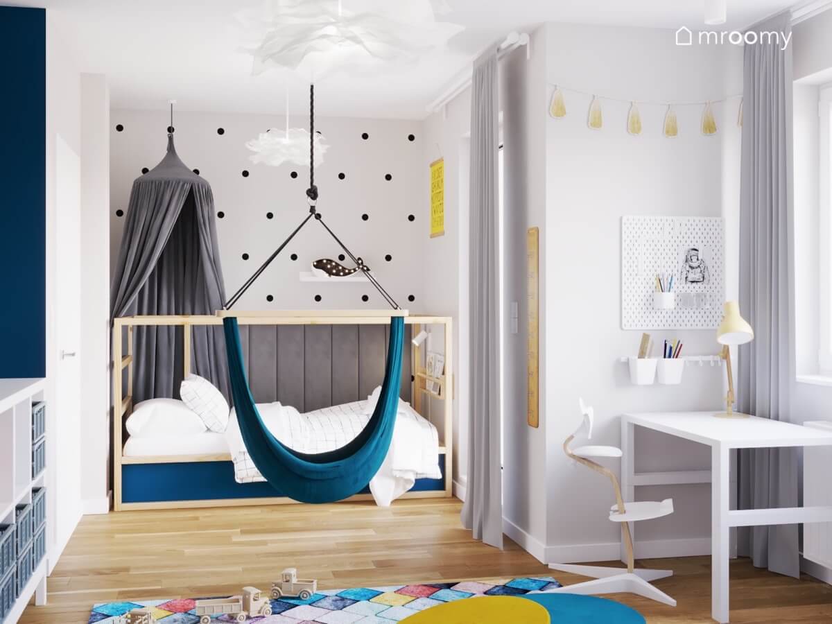 Projekt biało-niebieskiego pokoju dla chłopca z łóżkiem z baldachimem i huśtawką hamak