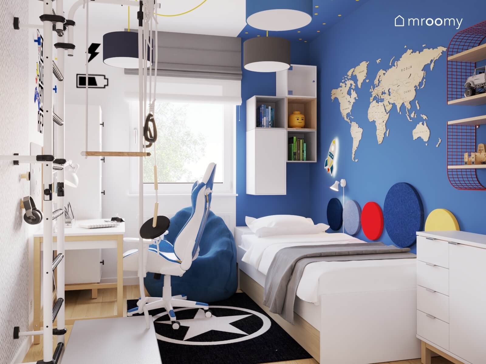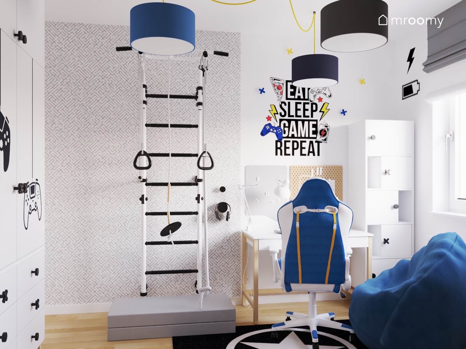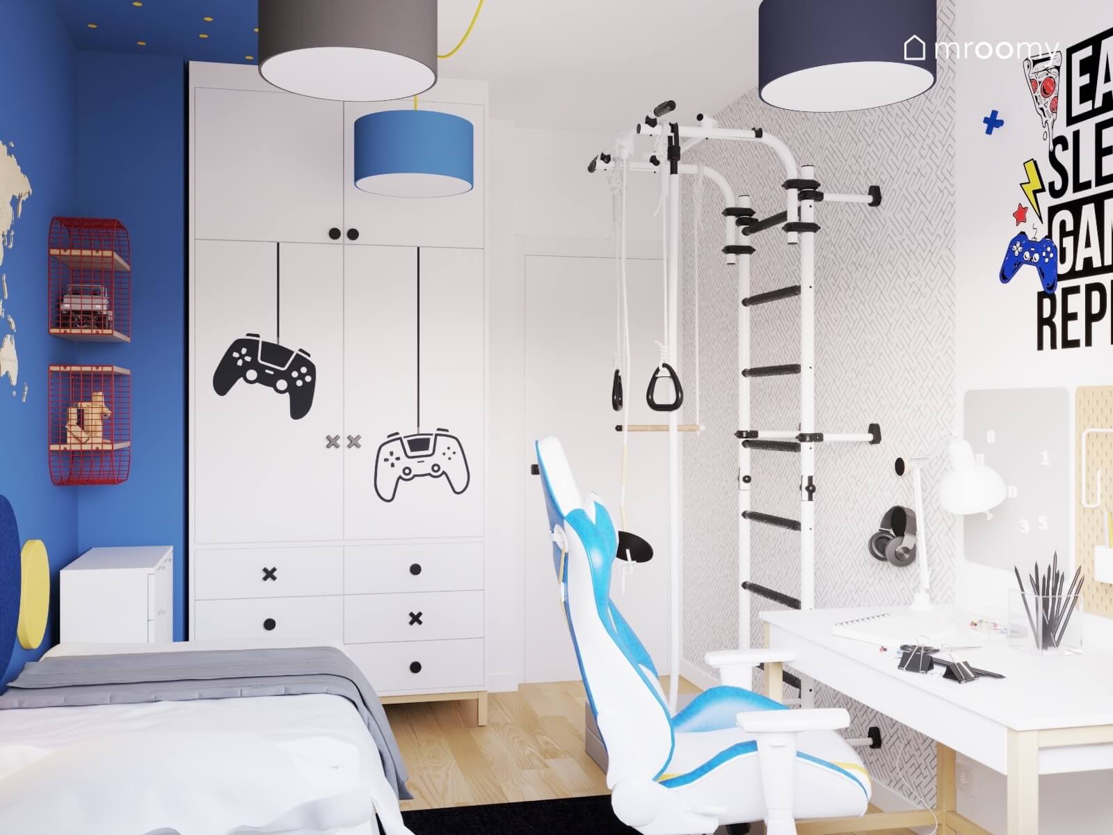 Projekt biało-niebieskiego pokoju dla chłopca z drabinką gimnastyczną