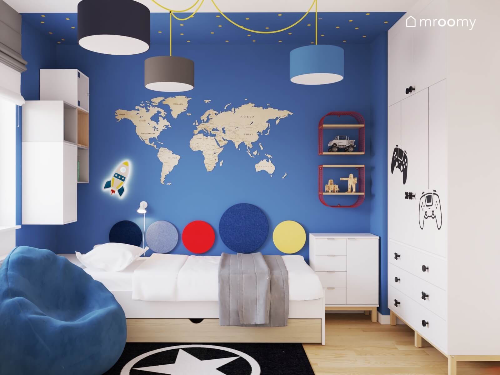 Całość oświetlają lampy sufitowe na wesołym żółtym okablowaniu oraz lampka-rakieta.