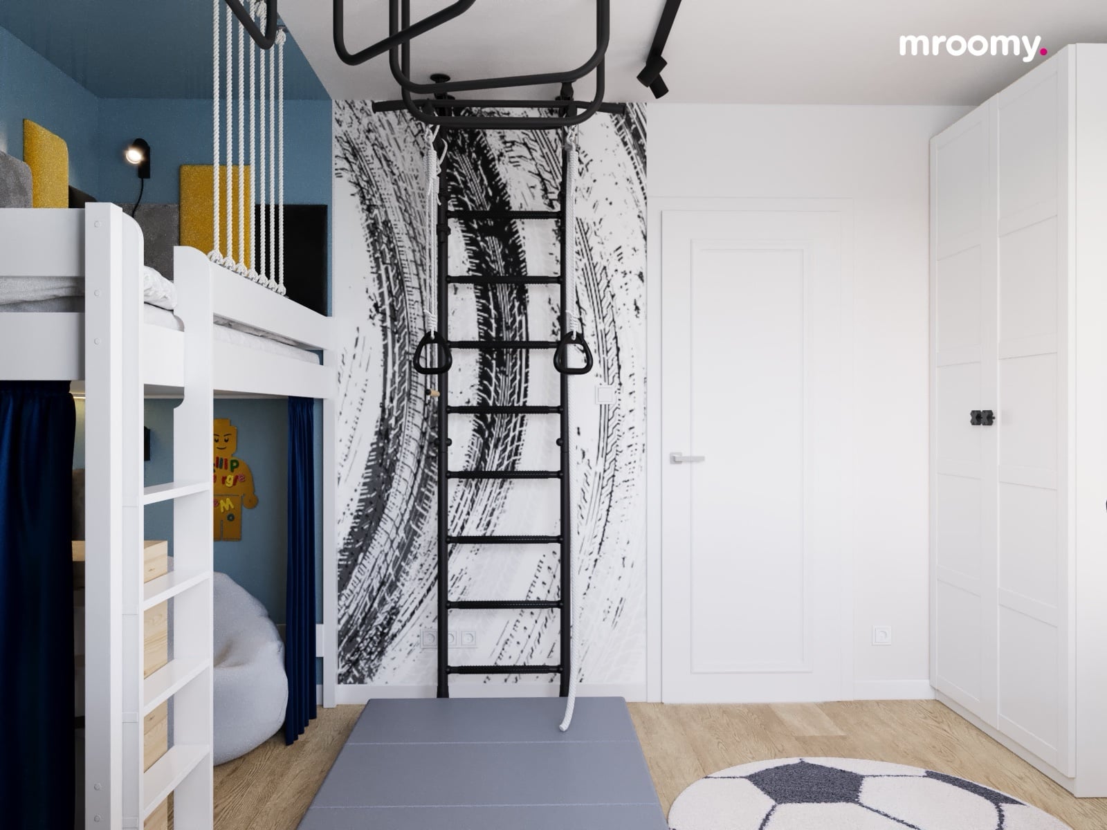 Projekt niebiesko-białego pokoju dla chłopca z systemem gimnastycznym i łóżkiem piętrowym
