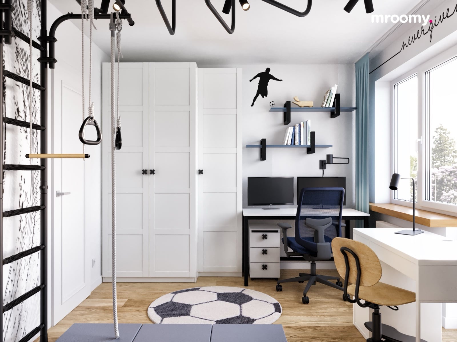Wysokie białe szafy oferują mnóstwo miejsca na ubrania, a półki ścienne idealnie sprawdzą się na książki i zabawki. Sportowe akcenty w postaci naklejek z piłkarzem i neon „Rest” tworzą nowoczesny pokój dla dziecka, który rośnie razem z jego zainteresowaniami.