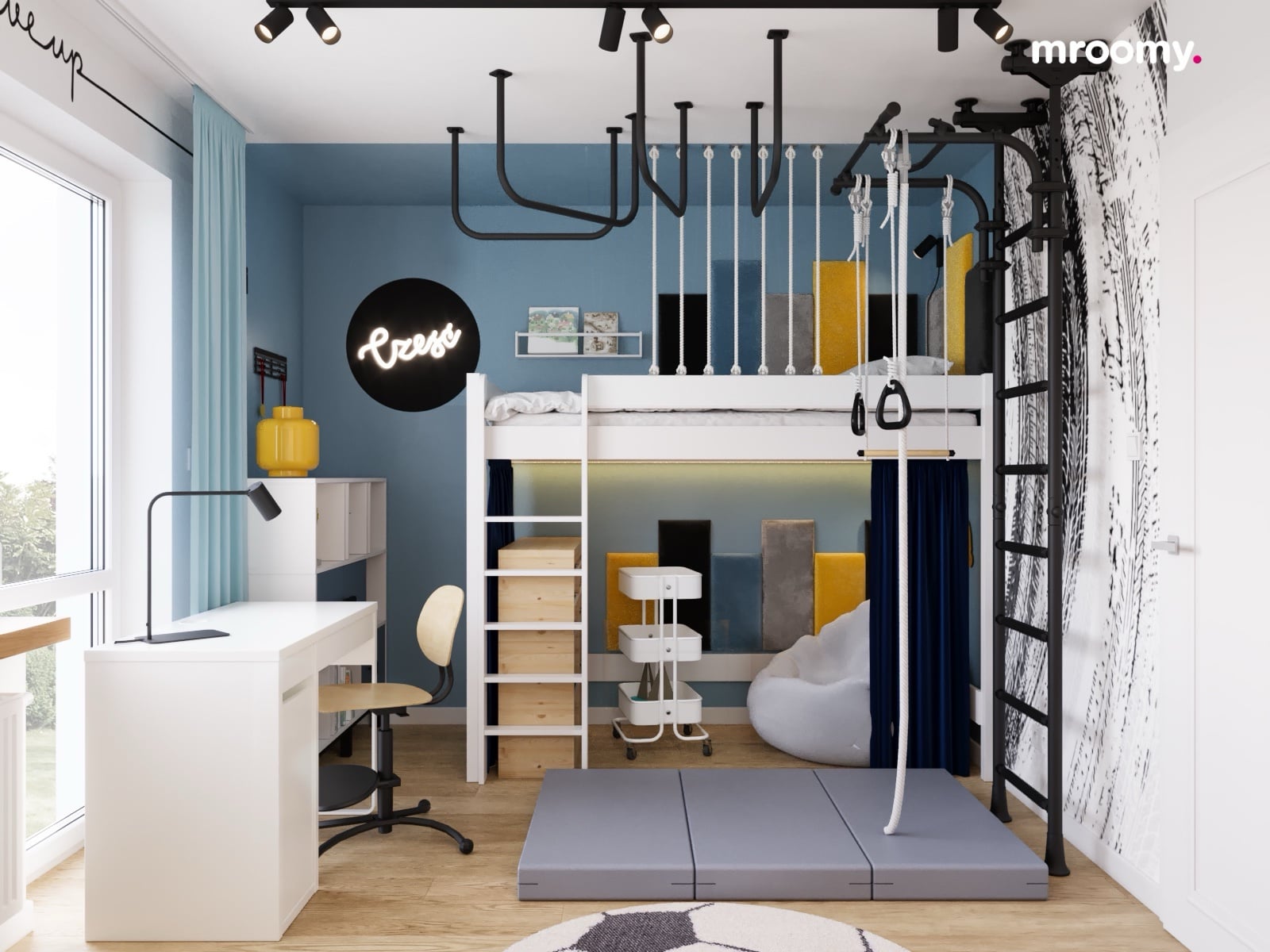 Najwyjątkowszym elementem tej inspiracji do pokoju dziecka jest system gimnastyczny z drabiną, kółkami i TRX. To nie tylko świetna zabawa, ale także sposób na codzienną aktywność fizyczną. Mata gimnastyczna zapewnia bezpieczne miejsce do ćwiczeń.