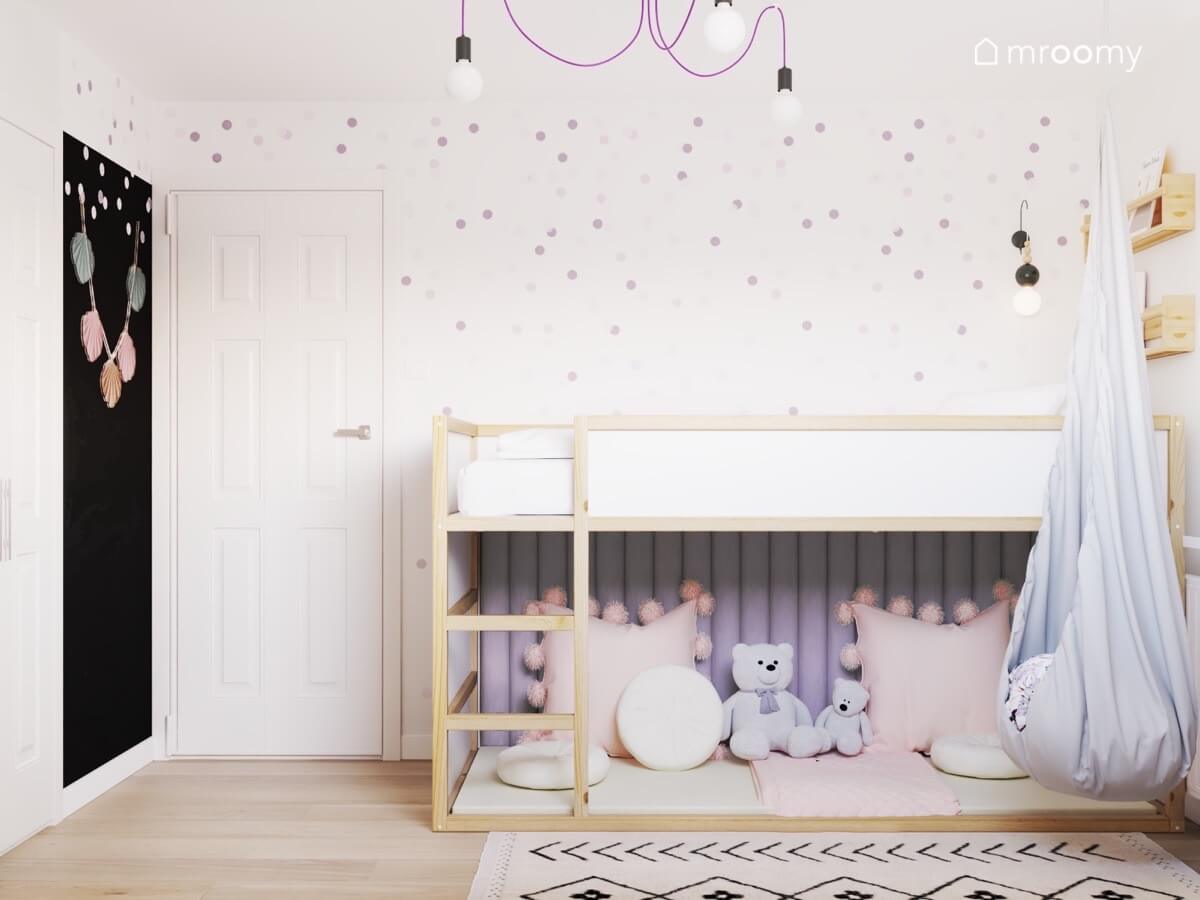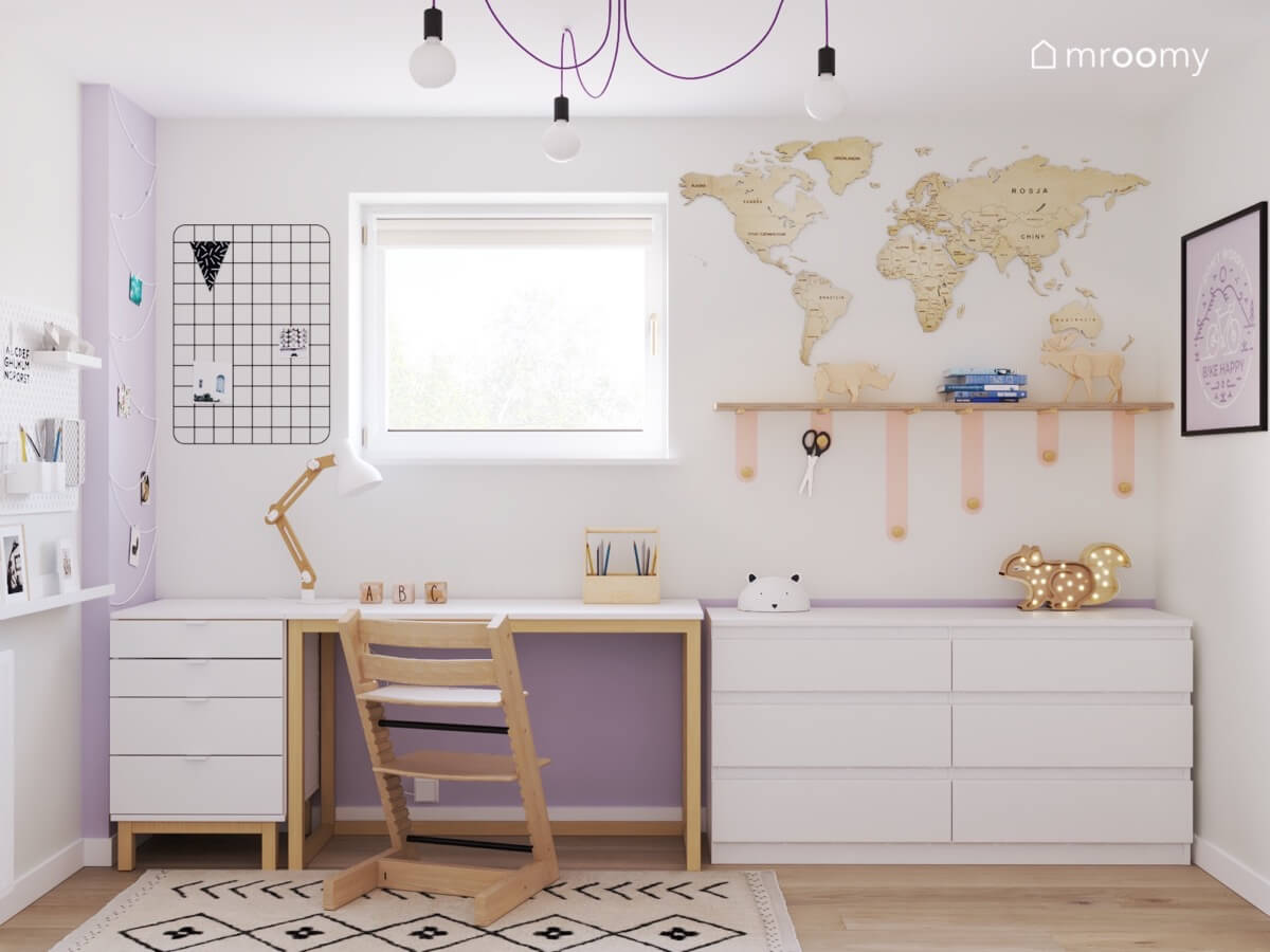 Ściany pokoju są białe, z nielicznymi fioletowymi fragmentami. Zdobią je równie radosne fioletowe kropki.