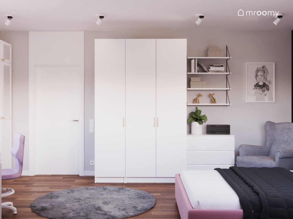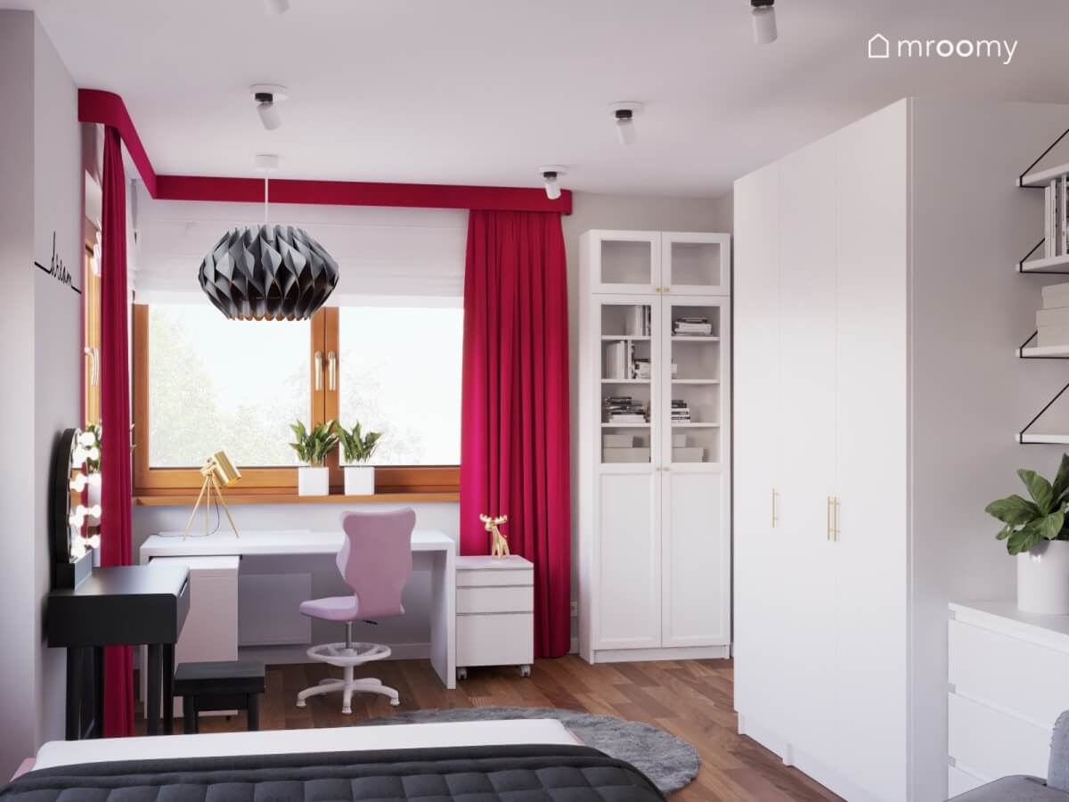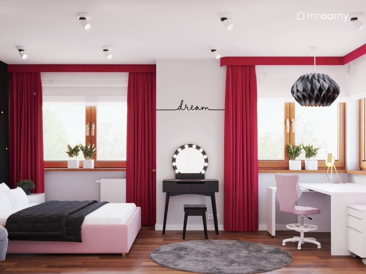 Projekt biało-czarnego pokoju dla dziewczynki z toaletką i różowym tapicerowanym łóżkiem