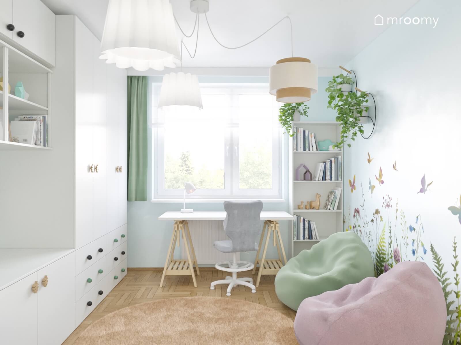 Projekt błękitnego pokoju dla dziewczynki z roślinnymi motywami i workami do siedzenia