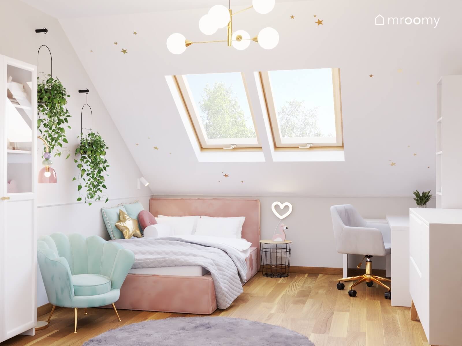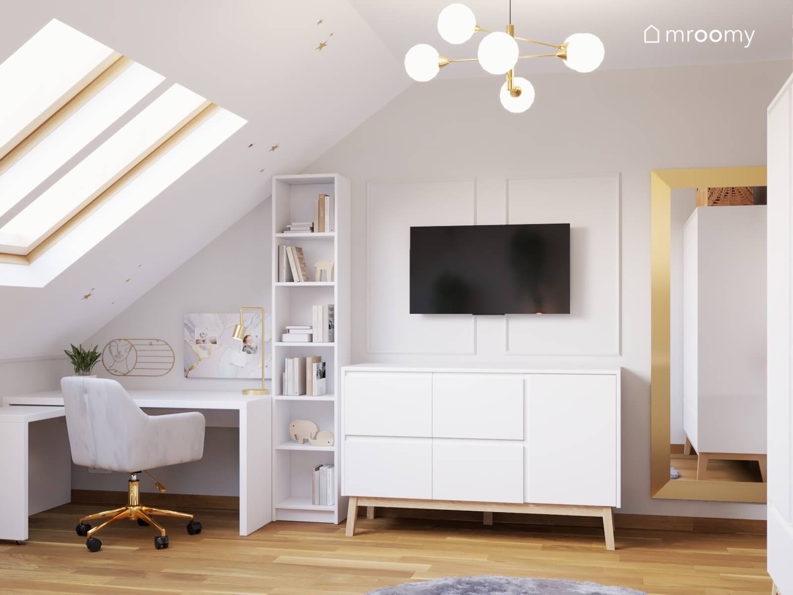 Wśród dodatków rządzi złoto. Są też rośliny doniczkowe. W pokoju nastolatki nie mogło zabraknąć dużego lustra w pasującej złotej ramie.