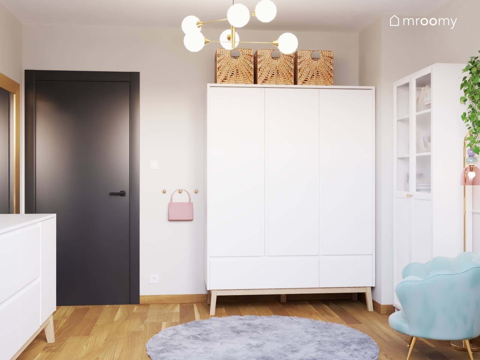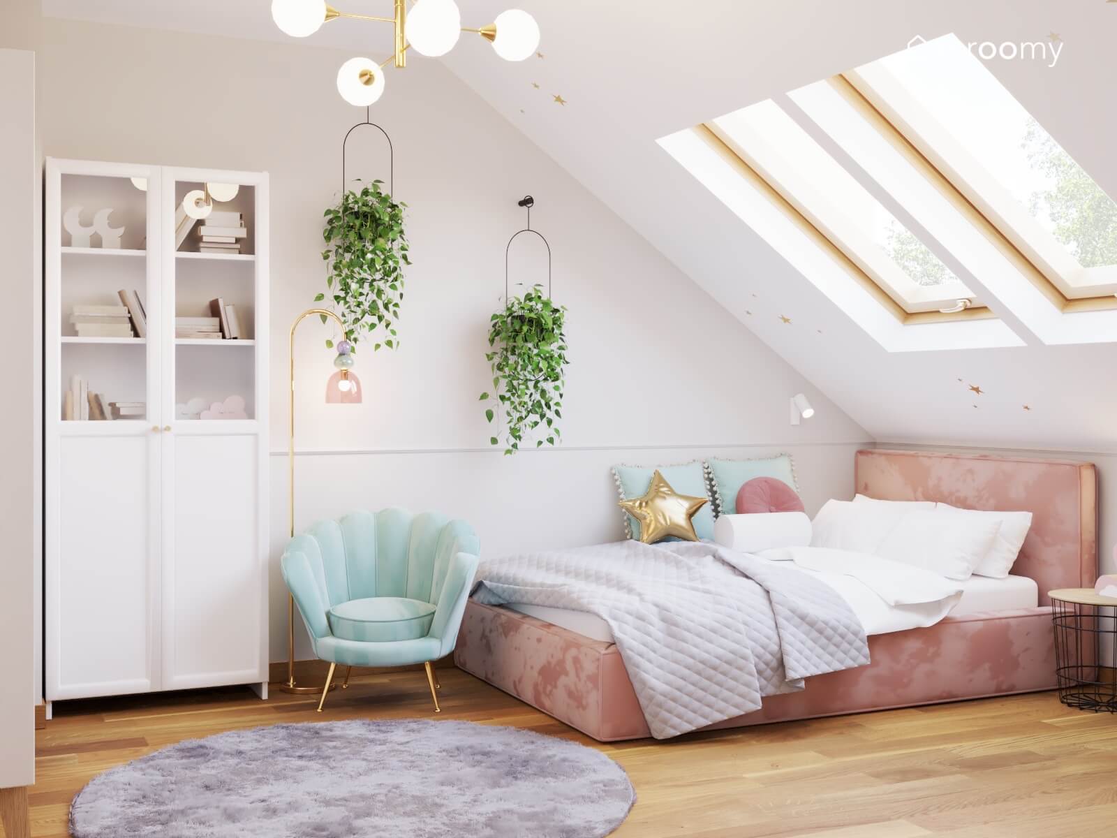 Oprócz prostych białych mebli w pokoju stanęło różowe tapicerowane łóżko, a także błękitny fotel w ciekawym kształcie.