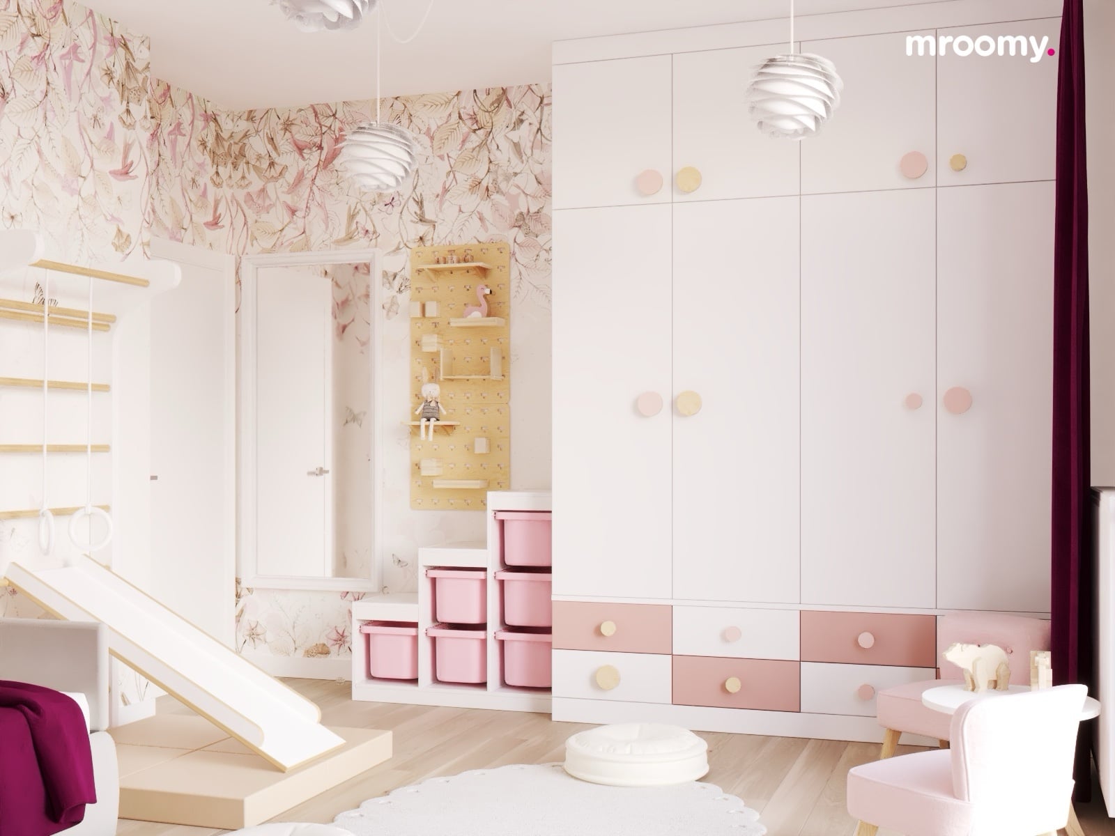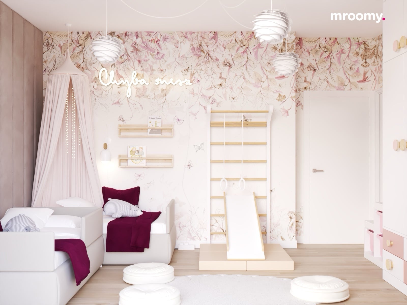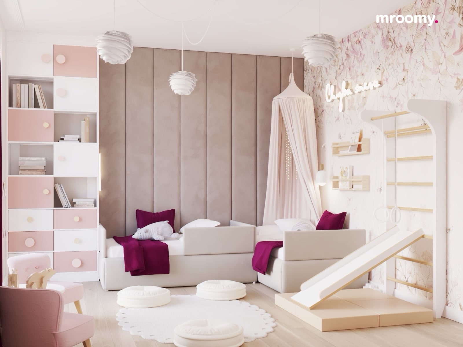 Projekt biało-różowego pokoju dla rodzeństwa z tapetą kwiatową i drabinką ze zjeżdżalnią
