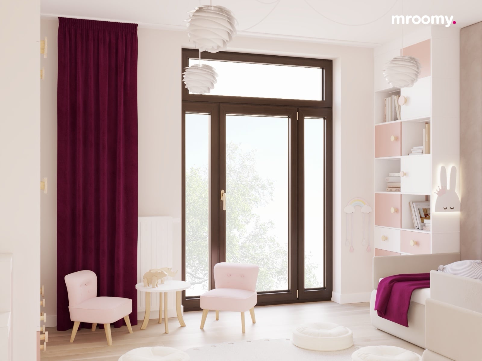 Dominująca delikatna paleta kolorów oparta na bieli, różu i beżu tworzy spokojną atmosferę idealną dla pokoju przedszkolaka i niemowlęcia. Eleganckie bordowe akcenty w postaci pościeli i zasłon dodają głębi całej aranżacji. Pokój w stylu skandynawskim charakteryzuje się również jasnymi drewnianymi elementami.