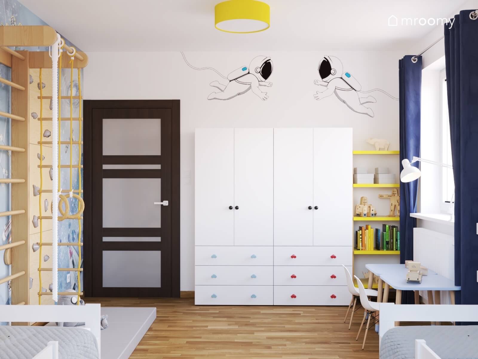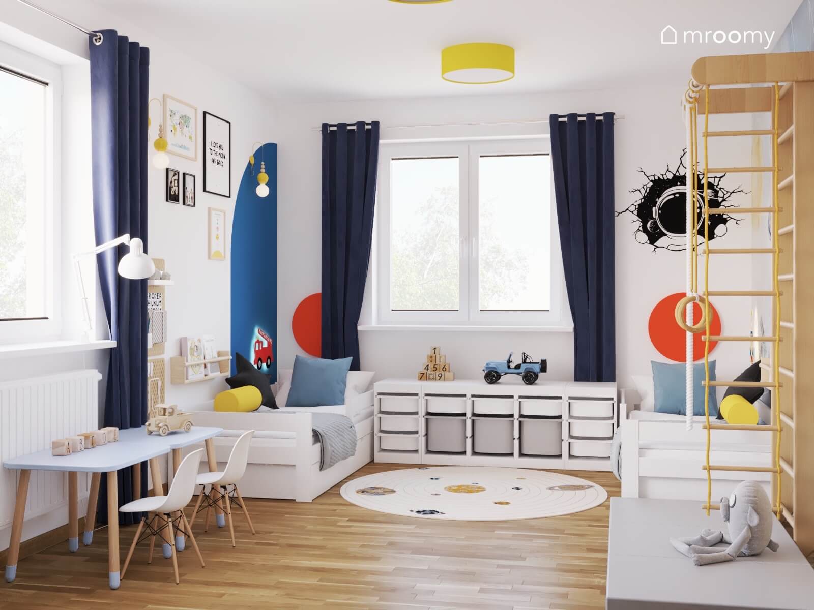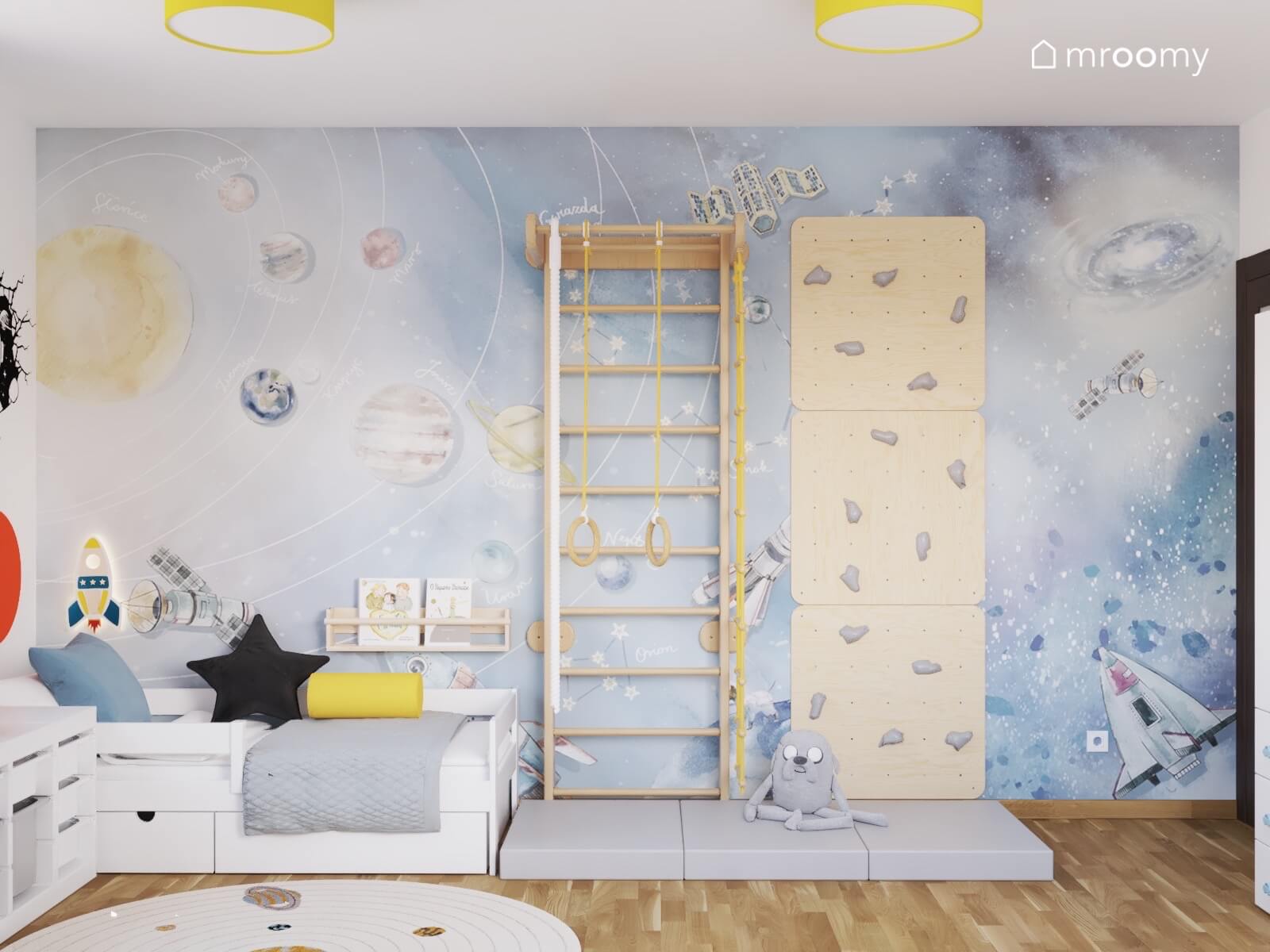 Projekt białego pokoju dla rodzeństwa z kosmiczną tapetą i kącikiem gimnastycznym