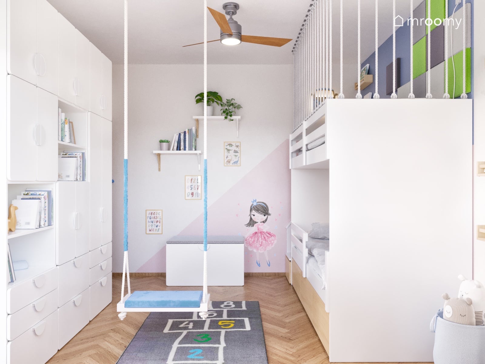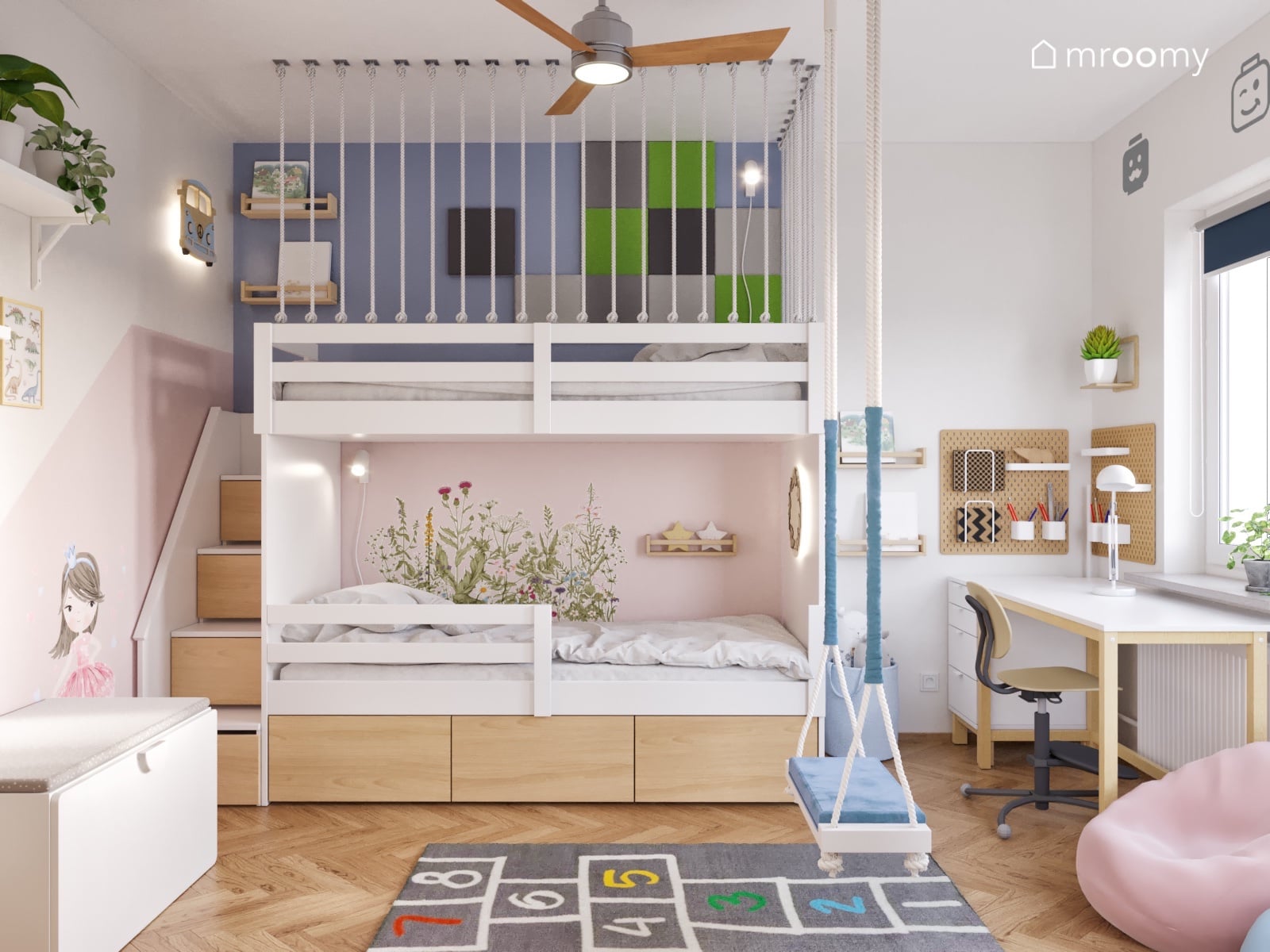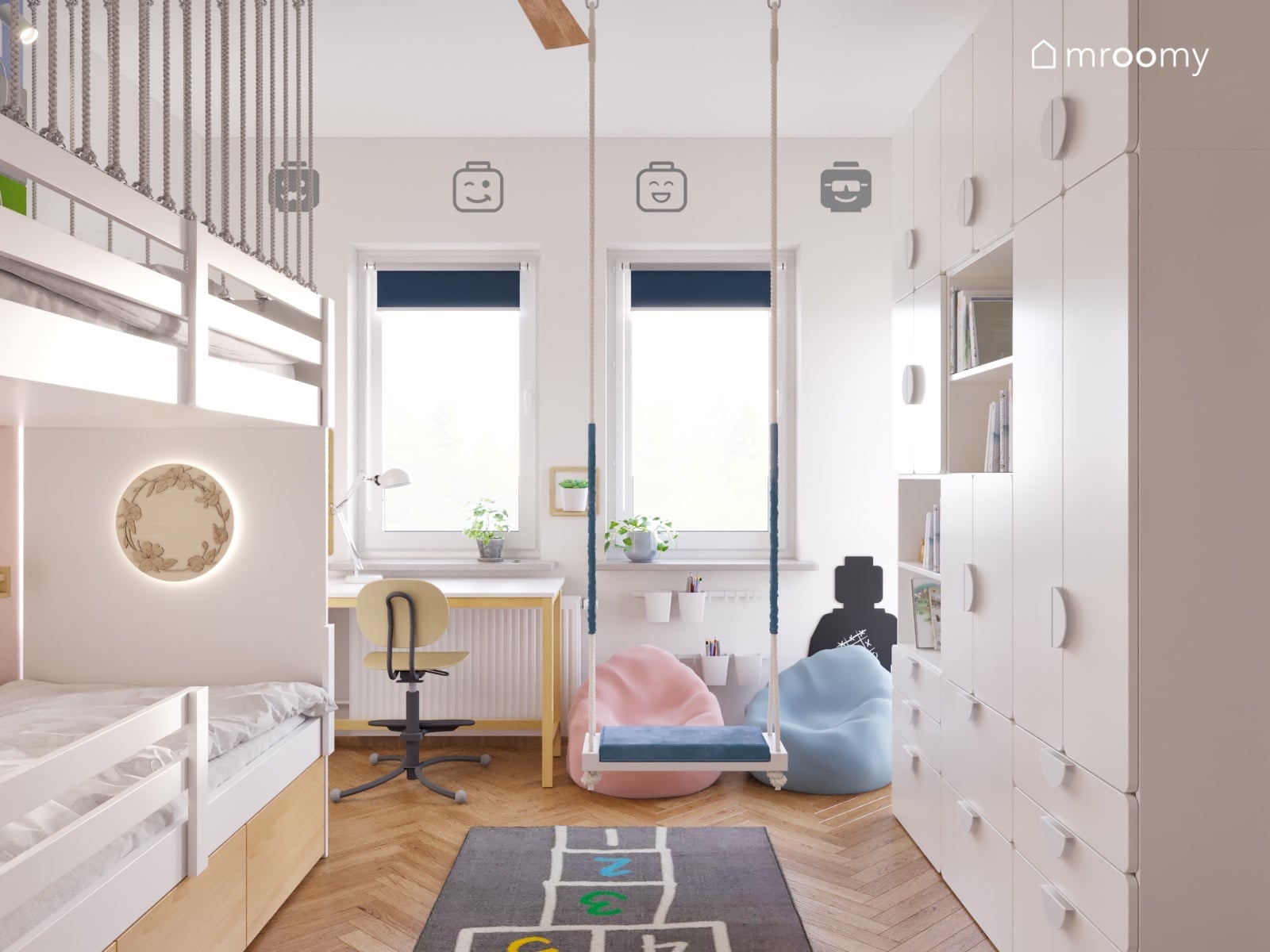 Projekt jasnego pokoju dla rodzeństwa z łóżkiem piętrowym i huśtawką