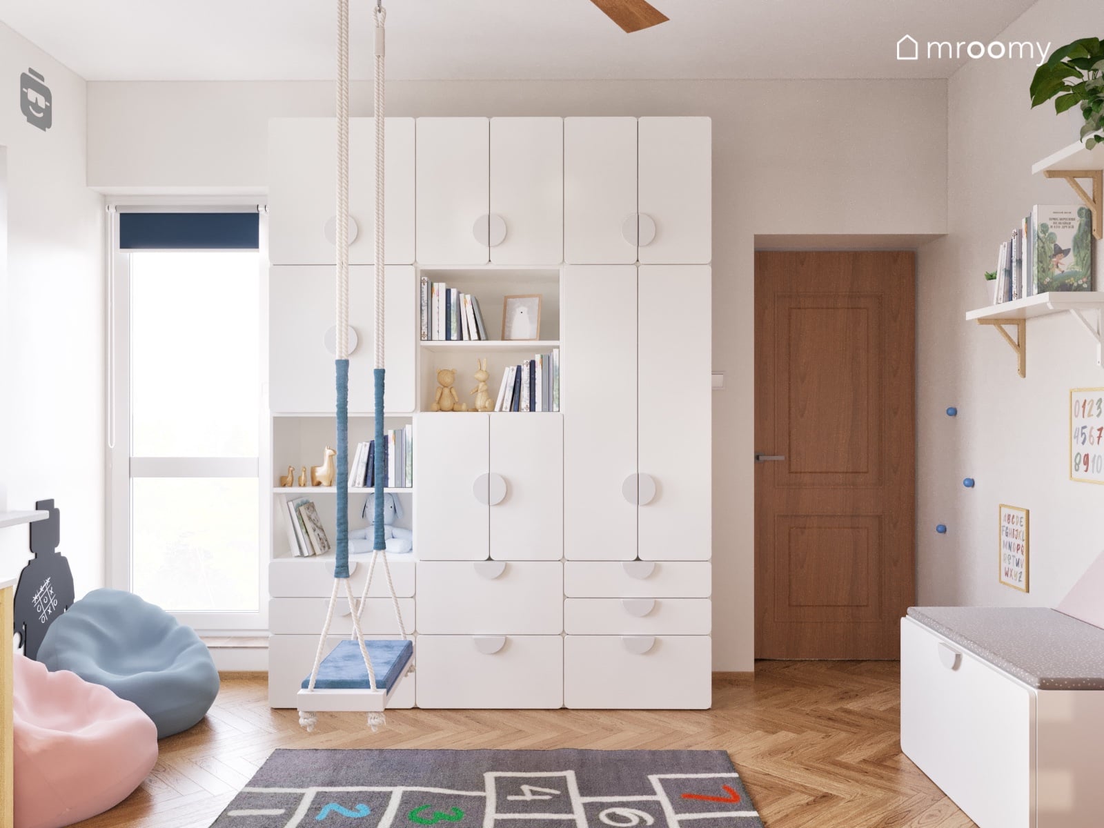 Ścianę zdobią naklejki LEGO i urocze ilustracje, które nadają wnętrzu dziecięcy charakter. Huśtawka wewnętrzna dodaje element zabawy, a rośliny na półkach wprowadzają naturalny akcent do tego nowoczesnego pokoju dla dzieci.