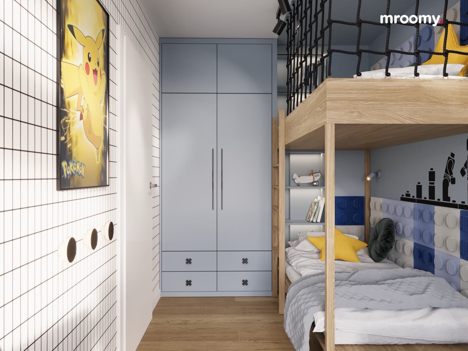 Funkcjonalne łóżko piętrowe z drewna to serce tej aranżacji pokoju dziecięcego. Solidna konstrukcja zapewnia bezpieczeństwo, a kolorowa tapicerka w stylu klocków LEGO na zagłówku dolnego łóżka wprowadza element zabawy. Metalowa siatka zabezpieczająca górne łóżko dodatkowo chroni sen dziecka.