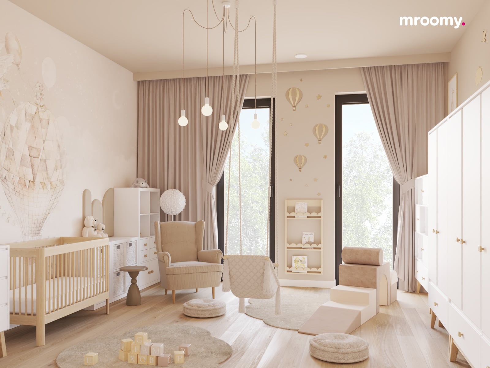 Dominują odcienie beżu, kremowej bieli i ciepłego drewna. Ściany pokryte są jasnobeżową farbą z delikatnymi akcentami w kolorze pudrowego różu. Na jednej ze ścian znajduje się fototapeta z motywem balonów w sepii. Złote elementy dekoracyjne – naklejki z balonami, chmurkami, ptakami i księżycem – pojawiają się na ścianach jako subtelne akcenty. Zasłony w kolorze zgaszonego beżu sięgają od sufitu do podłogi.