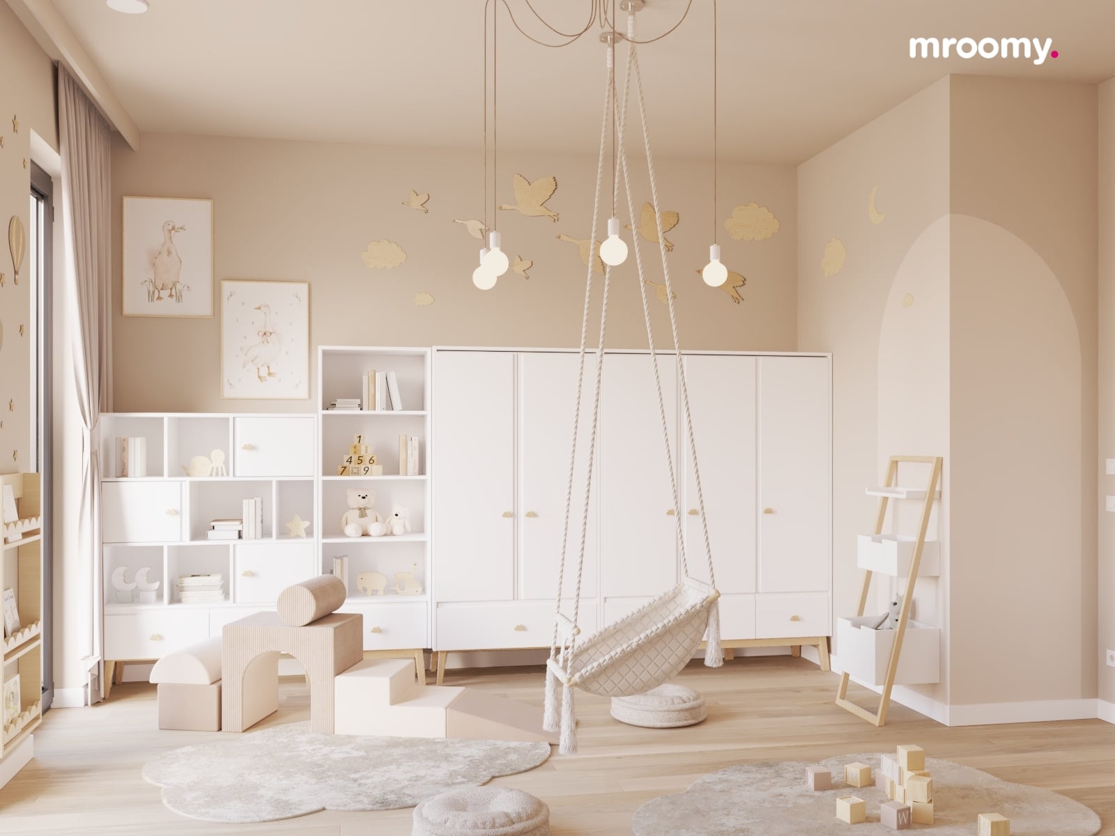 Centralnym elementem pokoju dla niemowlaka jest makramowa huśtawka zawieszona u sufitu. Na podłodze z jasnego drewna leżą dywany w kształcie chmurek oraz okrągłe pufy. Zestaw pianek do zabawy w odcieniach beżu i ecru tworzy przestrzeń do aktywności ruchowej. Oświetlenie stanowi lampa wisząca z kilkoma żarówkami na długich kablach oraz lampka w kształcie królika Miffy. Na półkach stoją pluszowe misie, drewniane zabawki i książeczki. Obrazki z motywem gęsi w drewnianych ramkach zdobią ściany.