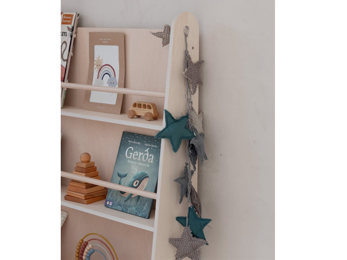 Trzy pojemne półki oferują nie tylko przestrzeń na ulubione książki, ale również dają możliwość kreatywnej organizacji dziecięcych skarbów. Biblioteczka może służyć zarówno jako tradycyjny regał na książki dla najmłodszych, jak i miejsce do przechowywania kolekcji zabawek czy ukochanych pluszaków. To mebel, który rozwija się wraz z zainteresowaniami Twojego dziecka.