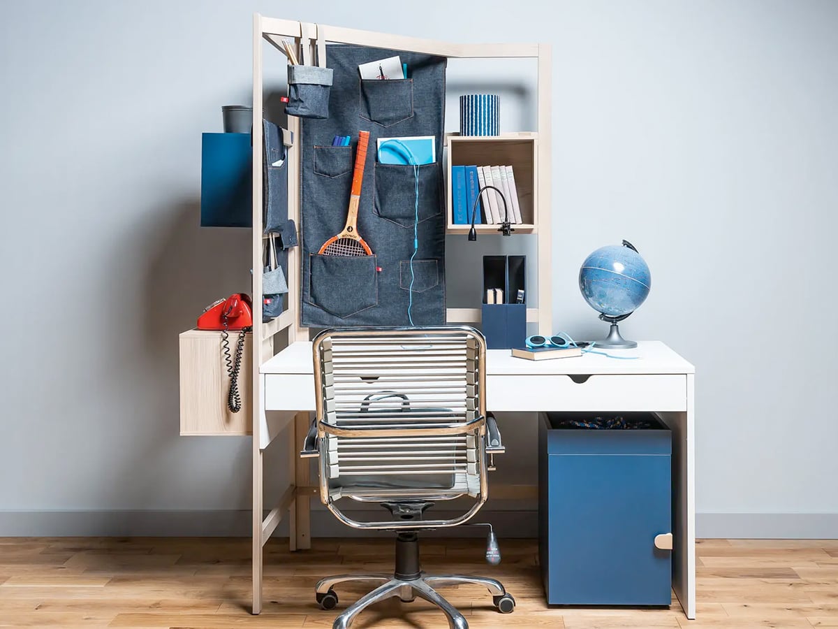 - Drewniana drabinka umożliwia zawieszenie dodatkowych akcesoriów takich jak organizery czy tablica korkowa