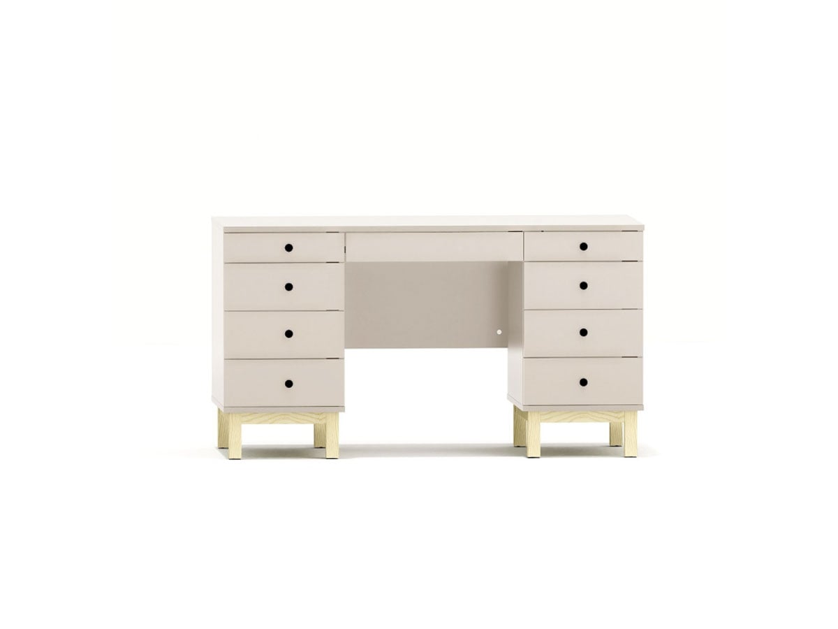 – szafka + szuflada po lewej. Cztery szuflady po prawej oraz szeroka szuflada podblatowa (łącznie 6 szuflad + szafka).