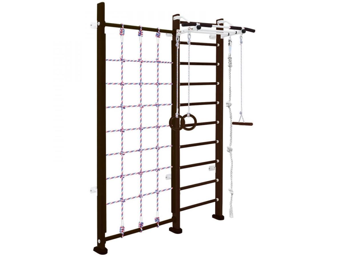 Rozbudowany zestaw gimnastyczny – siatka, drabinka, lina, trapez oraz koła gimnastyczne. Doskonała dla aktywnych dzieci, którym doskwiera brak ruchu.