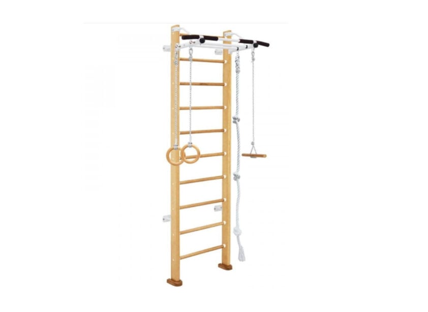 Drabinka, kółka gimnastyczne, lina oraz trapez – oto ona! Dostępna w kolorach: biały, jasne drewno, ciemne drewno (venge), niebieski, turkusowy, różowy.