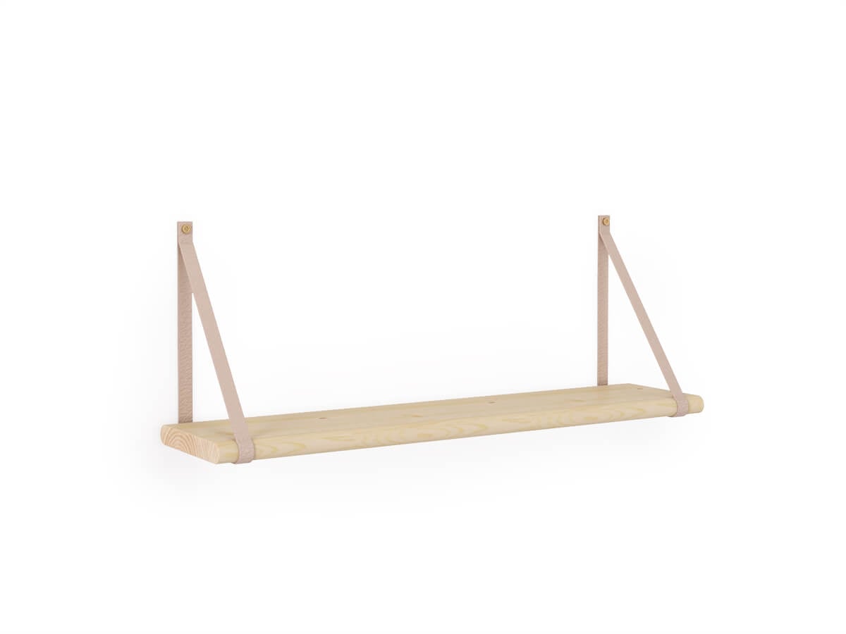 Sosnowa półka o długości ok. 60cm zawieszona na uchwytach wykonanych ze skóry naturalnej. Doskonale wpisze się w naturalne aranżacje pokoju dziecka.
