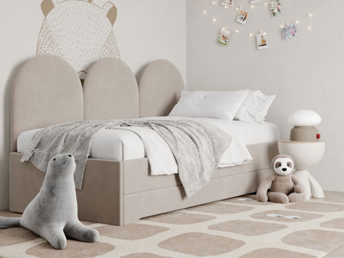 Całość uzupełniają miękkie panele ścienne o zaokrąglonych kształtach, dzięki czemu pokój zyskuje przytulny charakter. Wykończenie w tkaninie tapicerskiej dostępnej w wielu wariantach pozwala łatwo dopasować mebel do stylu wnętrza. Solidny stelaż i trwałe materiały gwarantują długie użytkowanie, a miękkie obicie sprawia, że łóżko jest z pewnością bezpieczne i komfortowe na co dzień.