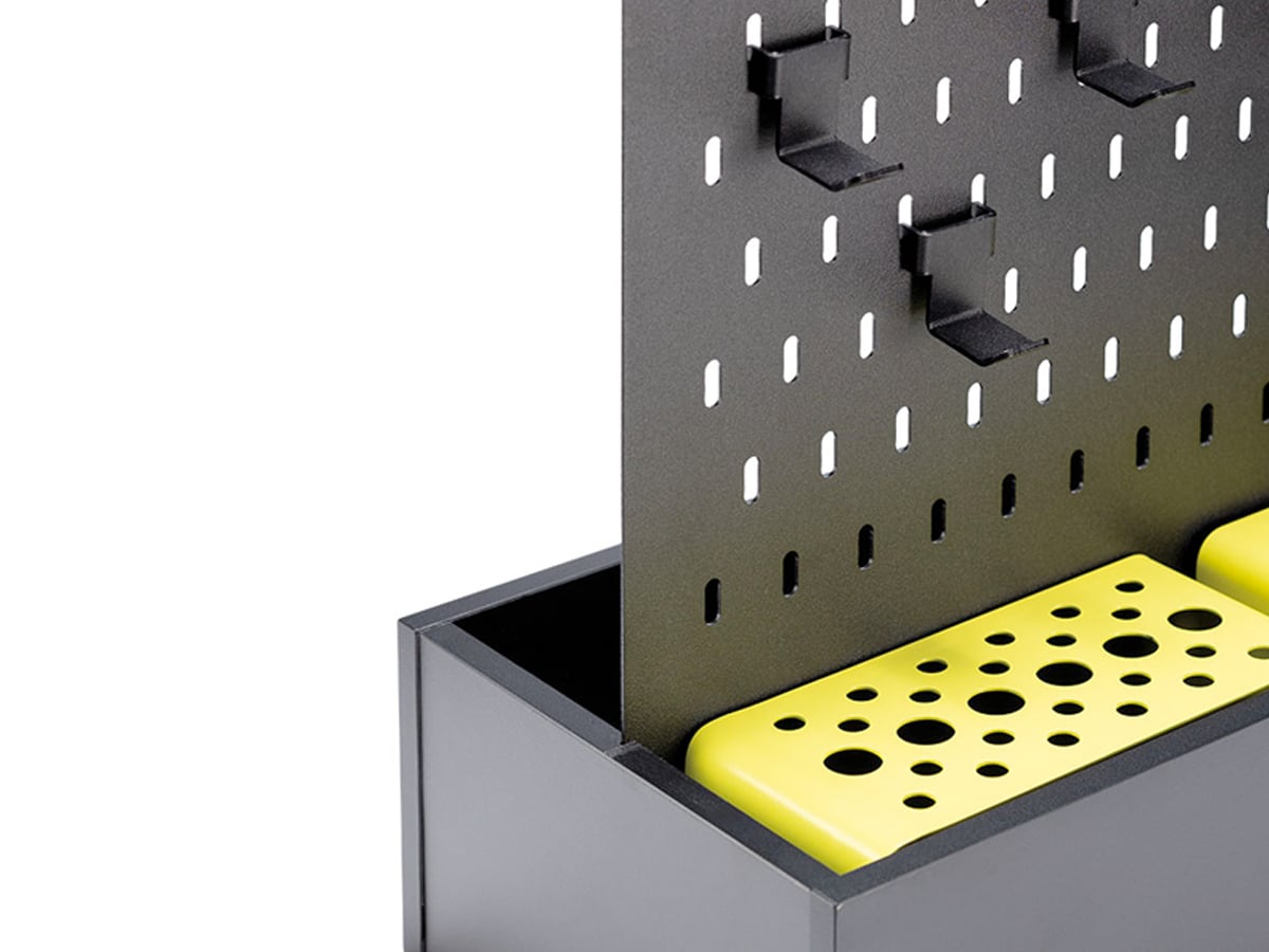 Ekspozytor Young Users to kompaktowy, dwustronny organizer z perforowaną tablicą i pojemną skrzynką – idealny na gamingowe akcesoria. Porządkuje przestrzeń i dodaje nowoczesny charakter wnętrzu dziecięcego pokoju.