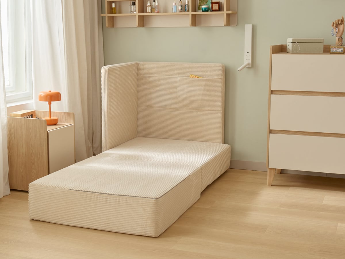 Fotel rozkładany Muve to funkcjonalny mebel idealny do pokoju dziecięcego — służy jako siedzisko i wygodne łóżko (85×170 cm). Łatwy w obsłudze, dostępny w kilku wariantach tkanin. Sprawdź, jak ułatwi codzienność!