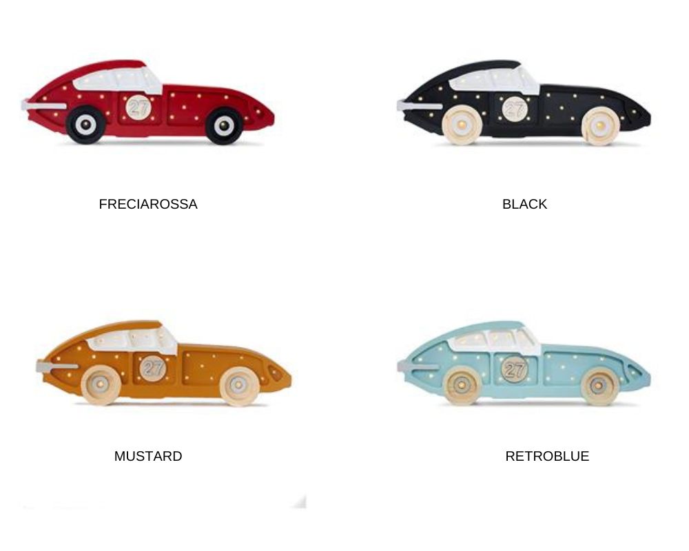 Lampka nocna w kształcie wyścigówki, wykonana z drewna sosnowego w czterech kolorach do wyboru. Doskonała do pokoju małego fana motoryzacji!
