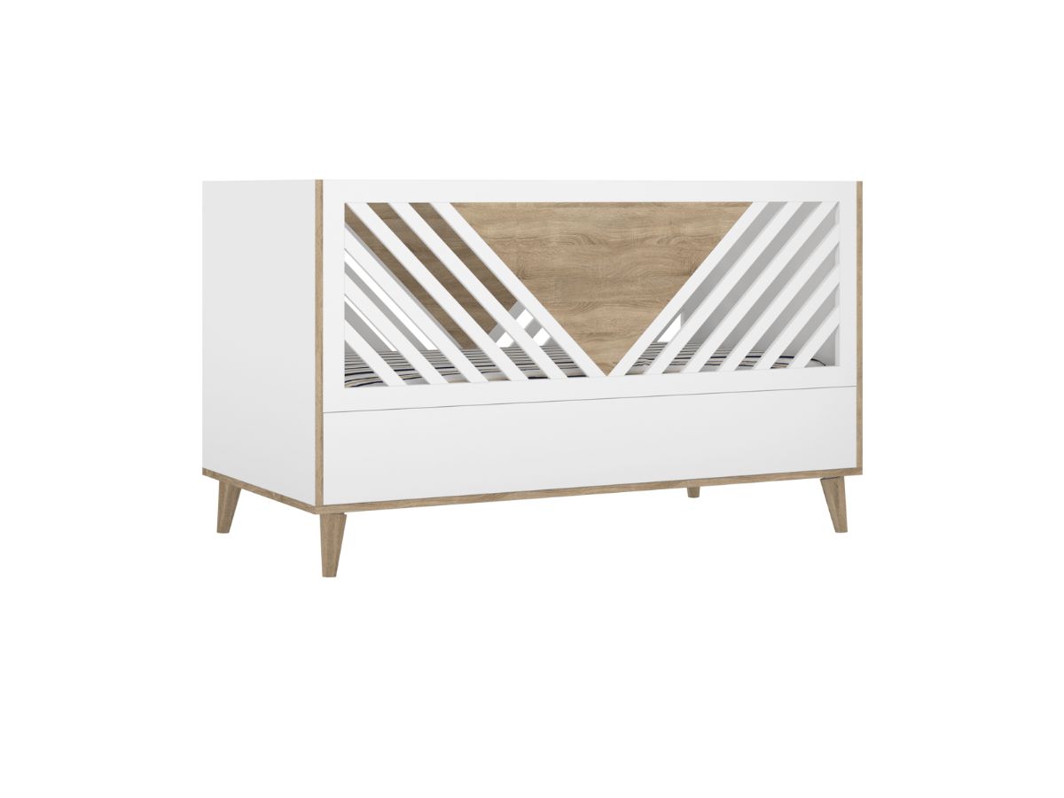 Łóżeczko z kolekcji TUTU to drewniany mebel z barierką o skośnym wzorze. Dzięki możliwości modyfikacji konstrukcji z łóżeczka na sofę posłuży Twojemu dziecku na lata.