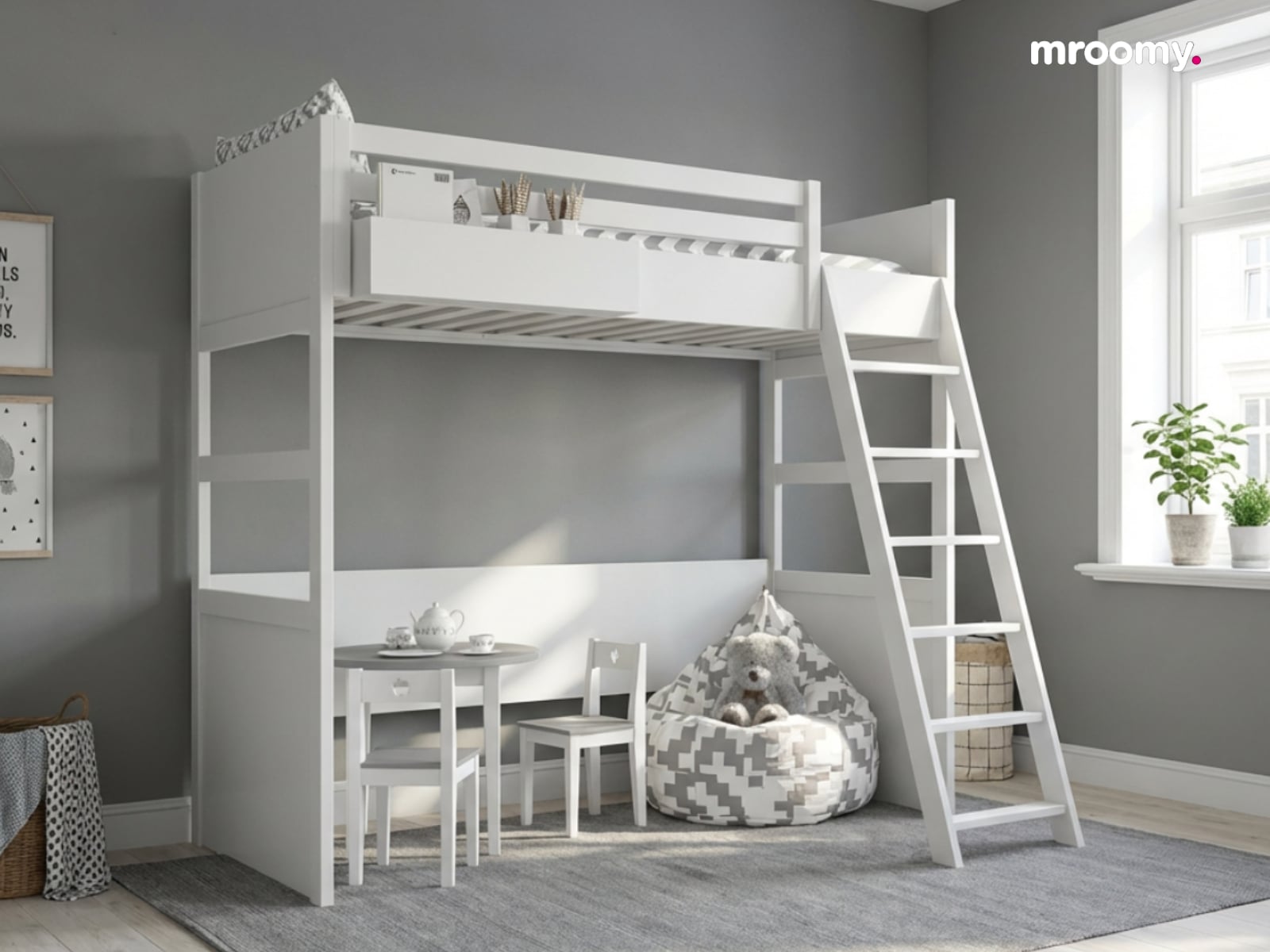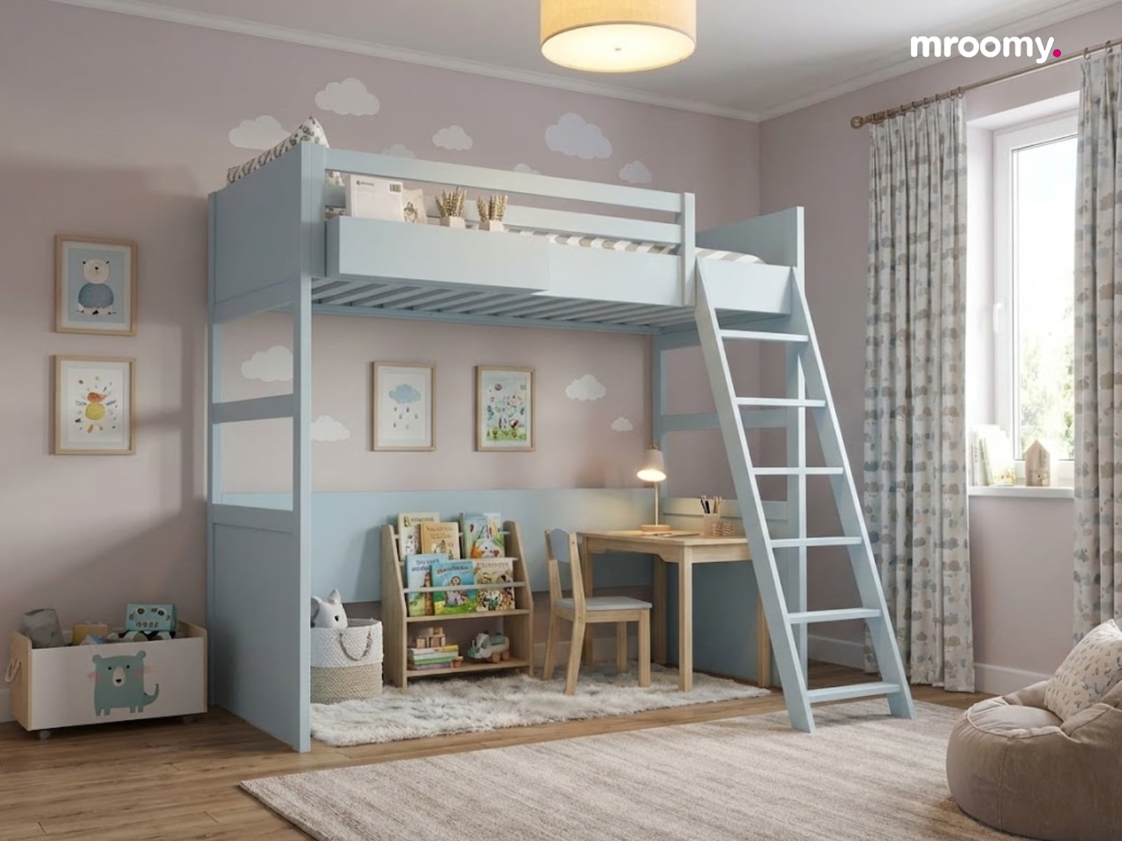 Funkcjonalne i praktyczne łóżko na antresoli, sprawdzi się w dziecięcym pokoju.