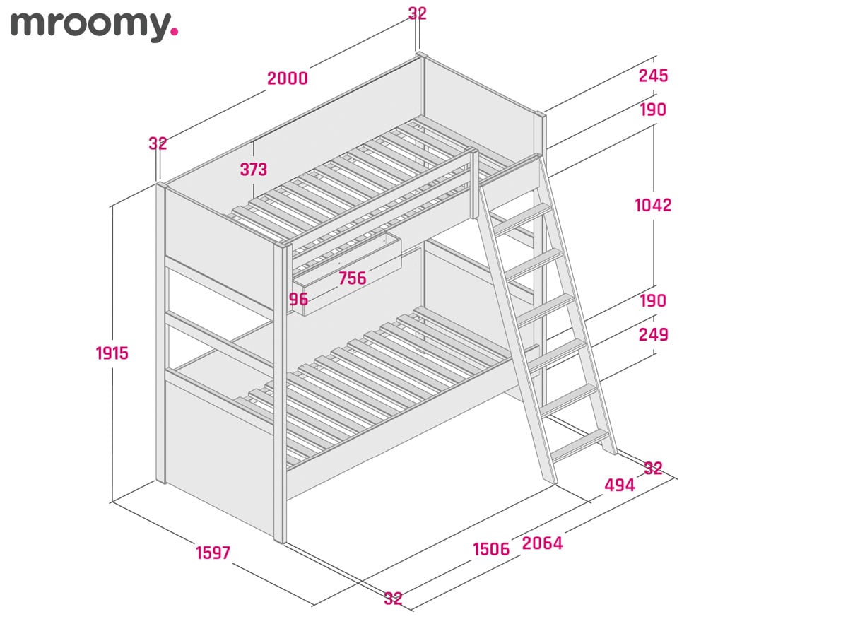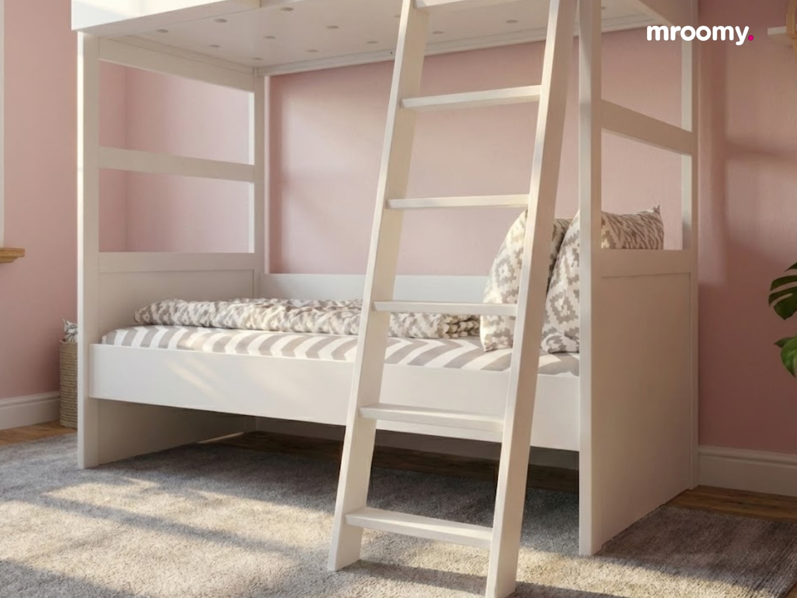 - umieszczenie drabinki pod kątem ułatwia wejście na górne łóżko, bezpieczne również dla mniejszych dzieci,
