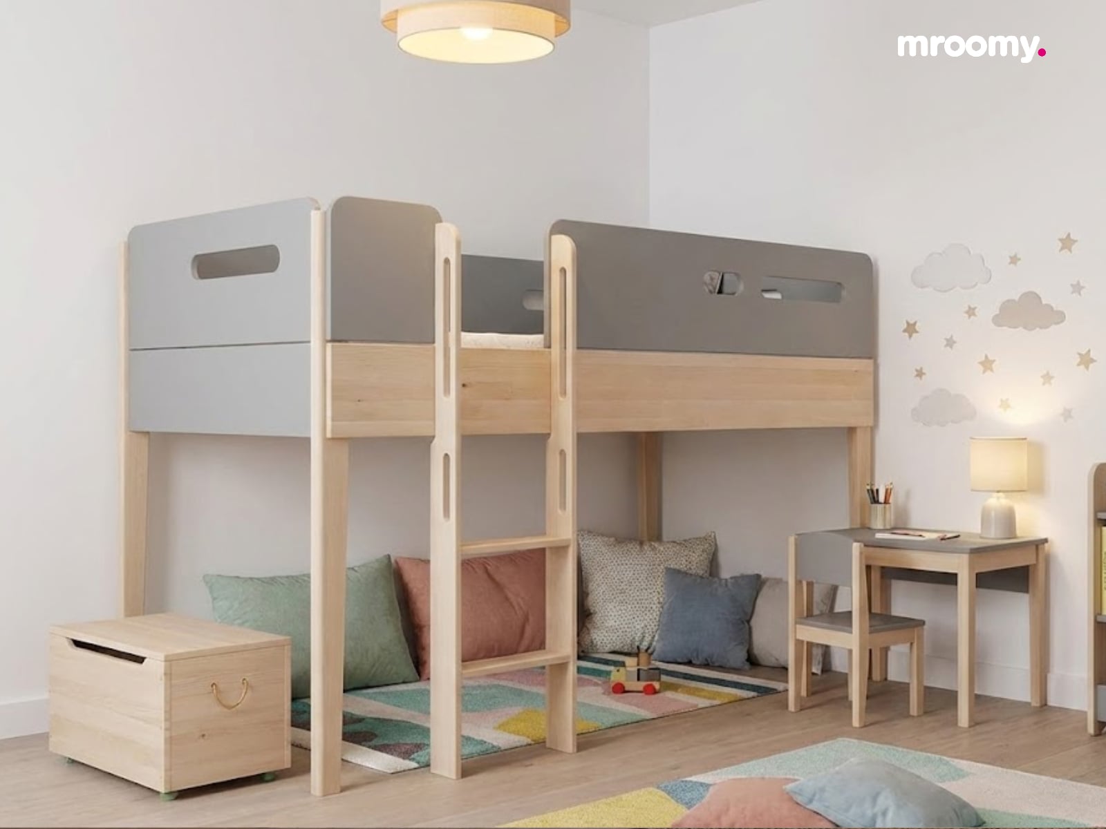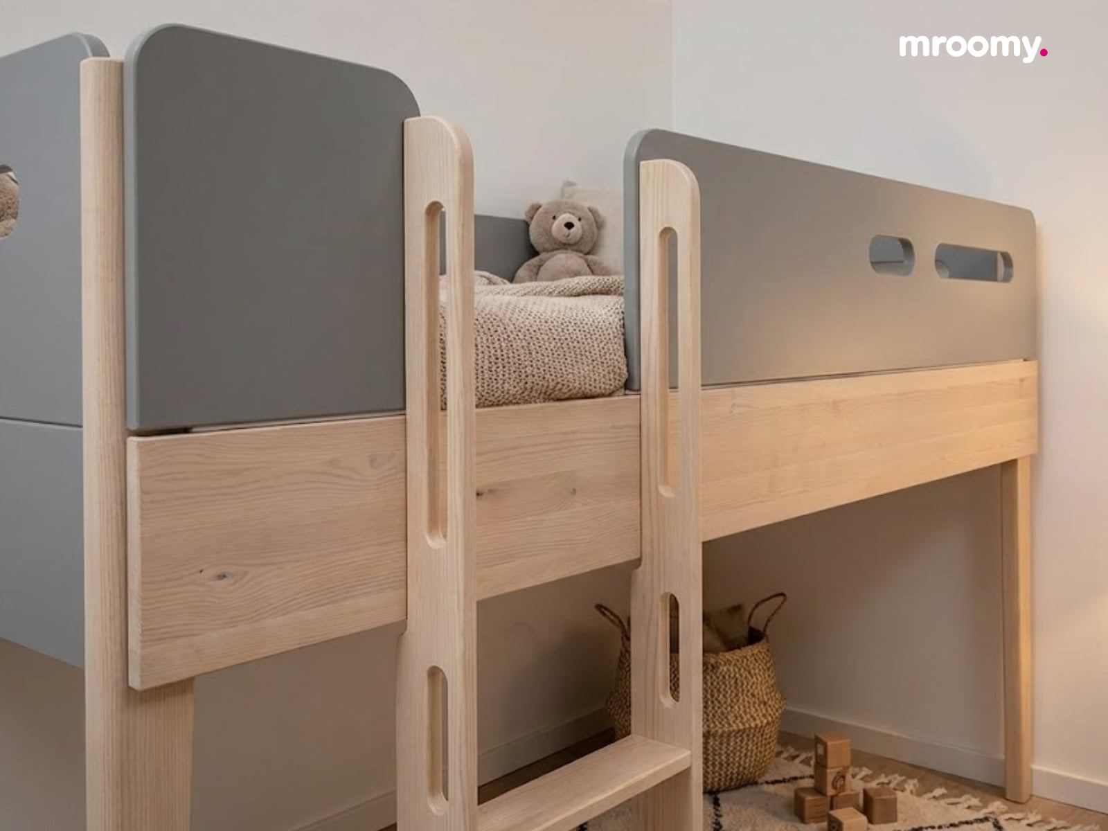 Łóżko piętrowe Minimondo to nowoczesne i bezpieczne rozwiązanie, aby w pełni wykorzystać przestrzeń w pokoju dziecięcym. Solidna konstrukcja z brzozowego drewna zapewnia stabilność, a możliwość podziału na dwa pojedyncze łóżka daje elastyczność na przyszłość. Minimondo to styl łączący naturalne drewno z malowanymi elementami, wprowadza do wnętrza lekkość i ponadczasową estetykę.