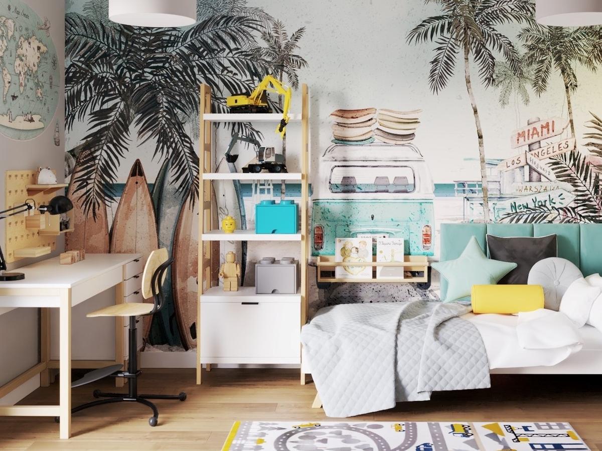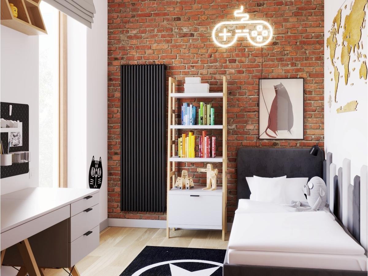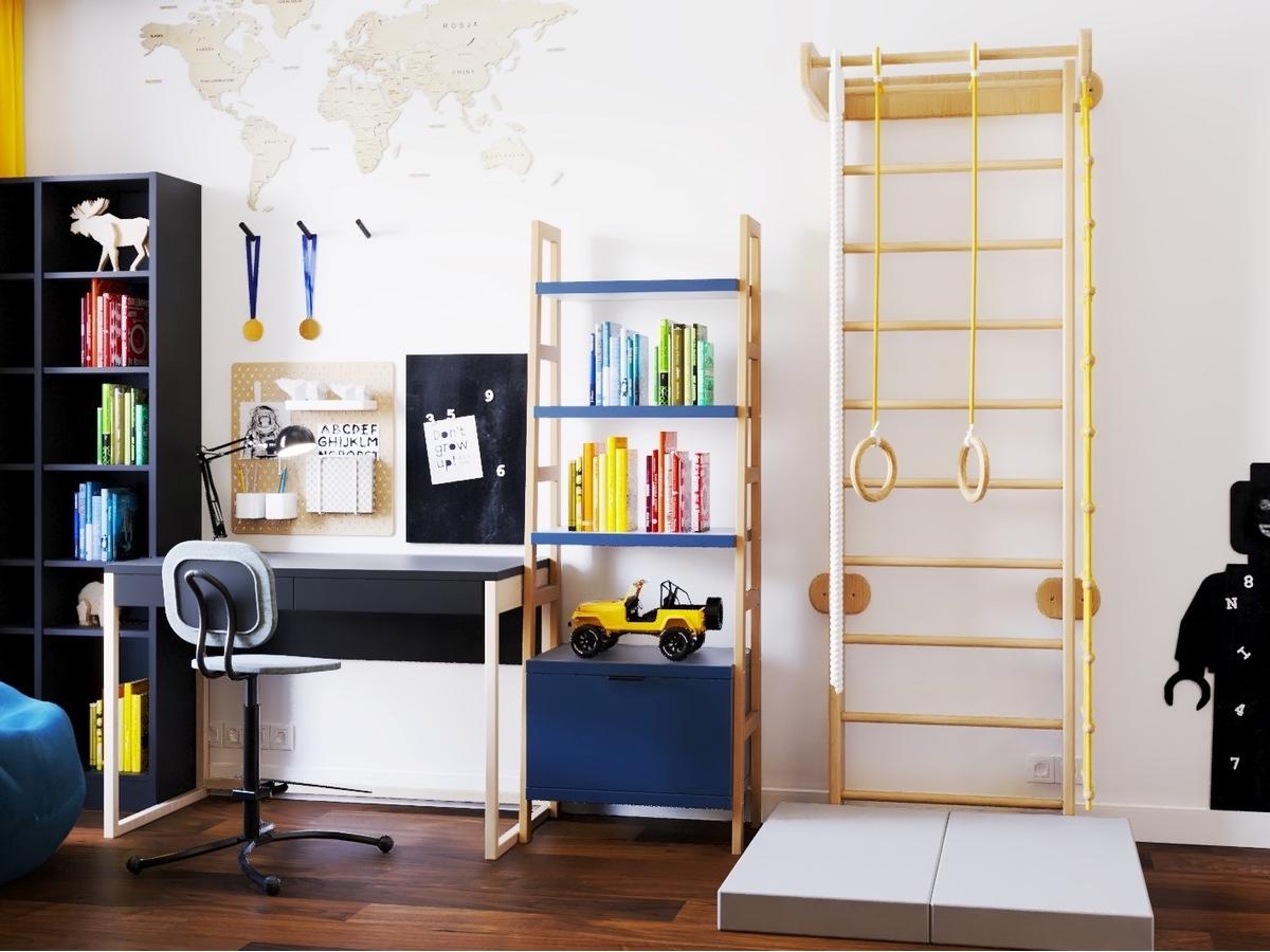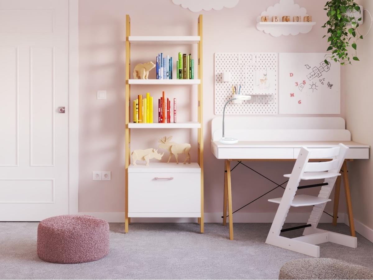 Regał w formie zabudowanej drabinki z dodatkową pojemną szufladą – minimalistyczny i funkcjonalny, idealny do pokoju dziecka.