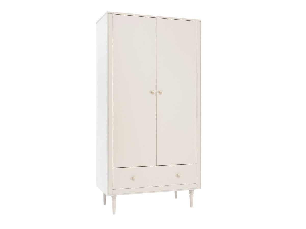 Uporządkuj przestrzeń dziecięcego pokoju z szafą dwudrzwiową Petite. Solidne bukowe nogi, szuflady soft close i przemyślany układ półek.