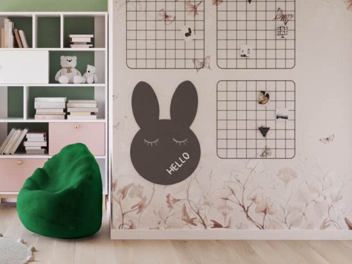Urocza tablica kredowo-magnetyczna w kształcie głowy królika z zamkniętymi oczkami . Można na niej przyczepić ozdobne magnesy, rysować i zapisywać notatki kredą.